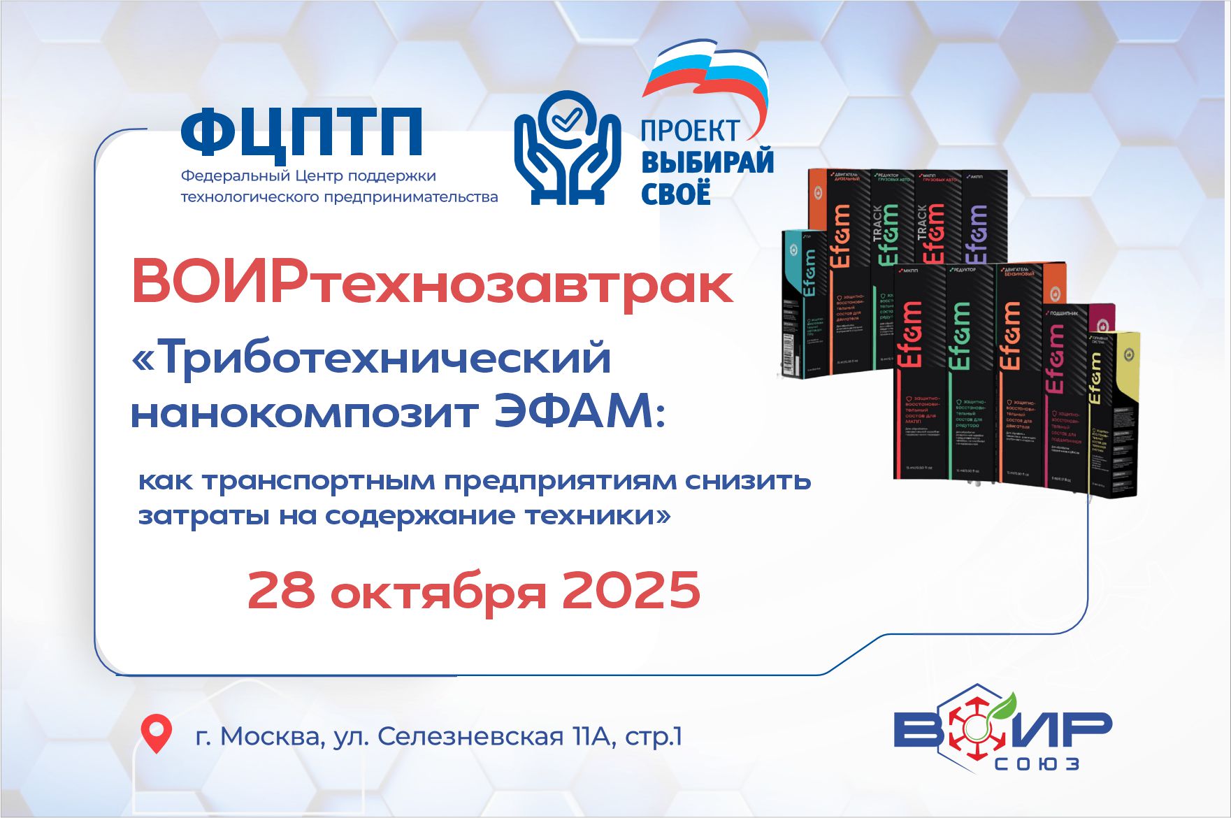 Технологию представит Жарков Василий Евгеньевич, генеральный директор ООО «Инновационная компания «Эфам-ТД». Он представит механизм действия состава, объяснит, как формируется защитный слой на поверхностях трения, и приведёт подтверждённые данные по эффективности: