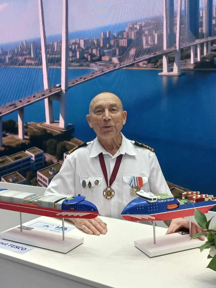 На стенде логистической компании «Росатома» член Центрального совета Союза ВОИР, ветеран компании ФЕСКО, капитан дальнего плавания Юрий Чашков представил два проекта, способных усилить связи между регионами и странами: